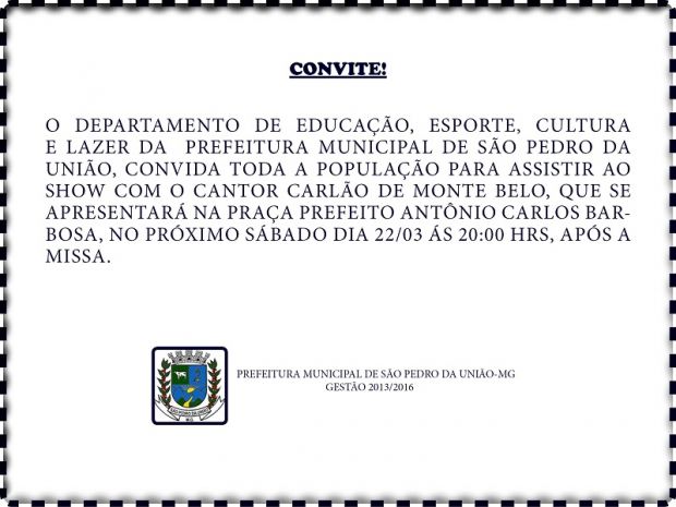 O DEPARTAMENTO DE EDUCAÇÃO, ESPORTE, CULTURA E LAZER DA PREFEITURA MUNICIPAL DE SÃO PEDRO DA UNIÃO, CONVIDA TODA A POPULAÇÃO PARA ASSISTIR AO SHOW COM O CANTOR CARLÃO DE MONTE BELO, QUE SE APRESENTARÁ NA PRAÇA PREFEITO ANTÔNIO CARLOS BARBOSA, NO PRÓXIMO SÁBADO DIA 22/03 ÁS 20:00 HRS, APÓS A MISSA.